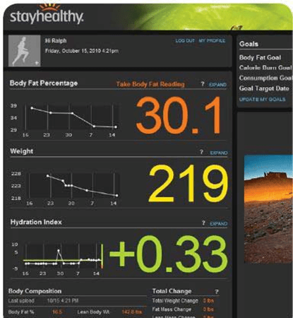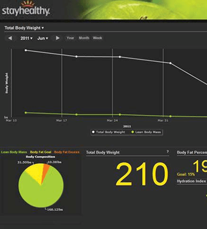Vedas saves your data on your secure health record. You and your Vedas team can easily access your record from any internet-enabled PC. Your online wellness dashboard tracks your progress and trends and goals, and charts your success. As a result, you can see your lean mass, body fat, hydration level, weight, and basal metabolic rate.